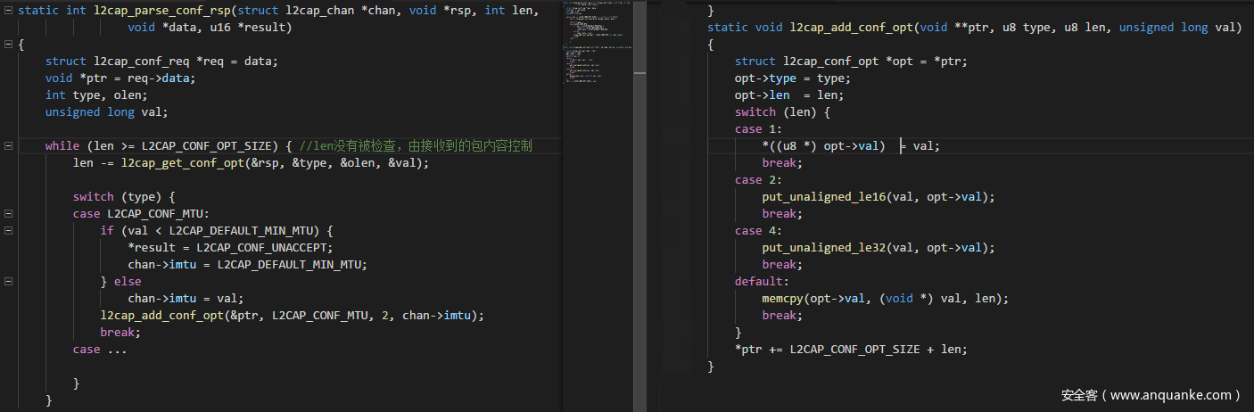 仔细阅读这个函数的代码可以知道,这个函数的功能就是根据传进来的包,来构造将要发出去的包。而数据的出口就是传进去的64字节大小的buf。但是对传入的包的数据的长度并没有做检验,那么当len很大时,就会一直往出口buf里写数据,比如有64个L2CAP_CONF_MTU类型的opt,那么就会往buf里写上64*(L2CAP_CONF_OPT_SIZE + 2)个字节,那么显然这里就发生了溢出。由于buf是栈上定义的数据结构,那么这里就是一个栈溢出。