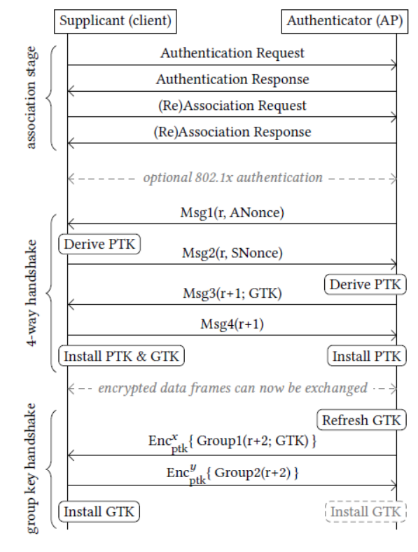 1,2 条消息使用来传输 nonces,最后两条消息是用来传输组密钥 而且使用抵御降级攻击注意:在已经存在的连接中,PTK 可以被刷新初始化新的四次握手。在密钥重载的过程中,所有的四次握手