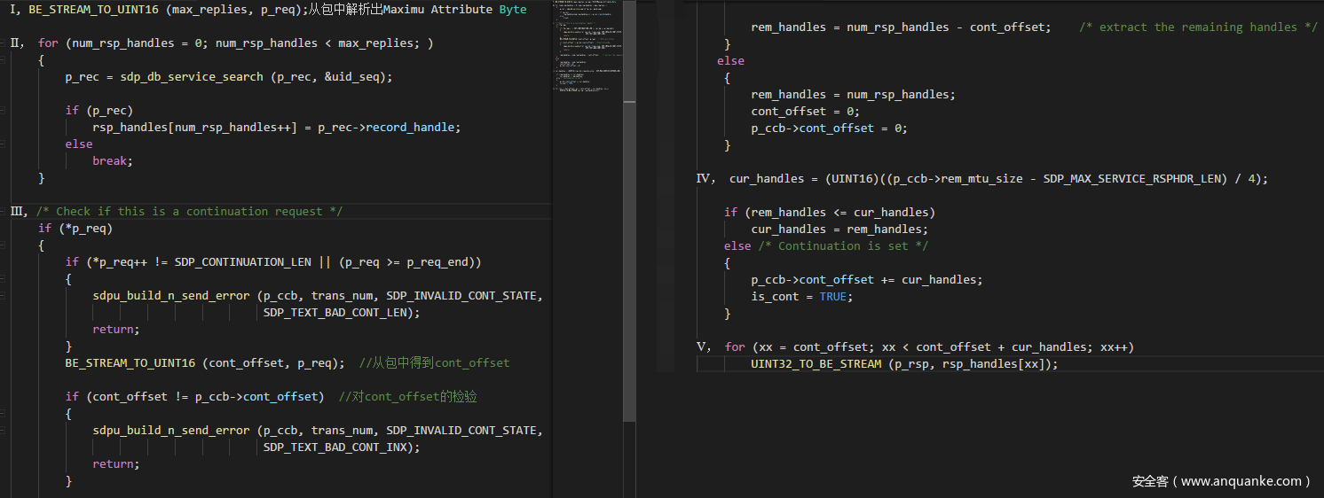 - 发送一个带cstate的包,cont_offset指定为刚刚提取的值,而且设置Maximu Attribute Byte字段为0。那么服务端收到这个包后,就会走到rem_handles = num_rsp_handles – cont_offset 从而发生整数下溢,同时p_ccb->cont_offset又递增一个cur_handles大小。