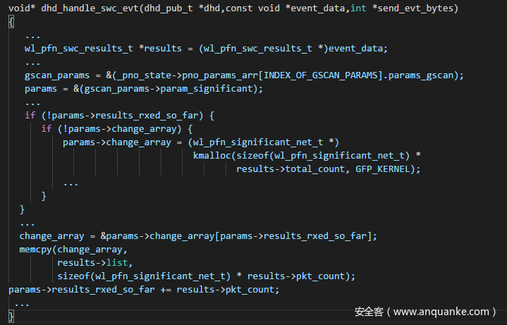 该漏洞太过复杂,一些先决条件我们不进行探讨,直接指出到漏洞关键点:处于dhd_handle_swc_evt 函数的total_count字段。