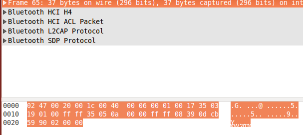 图上把蓝牙的各个层次关系描述得很详尽,不过我们这里暂时只需要关心这么几层:HCI,L2CAP,BNEP,SDP。BNEP和SDP是比较上层的服务,HCI在最底层,直接和蓝牙设备打交道,而承载在蓝牙服务和底层设备之间的桥梁,也就是L2CAP层了。每一层都有它协议规定的数据组织结构,所有层的数据包组合在一起,就是一个完整的蓝牙包(一个SDP包为例):