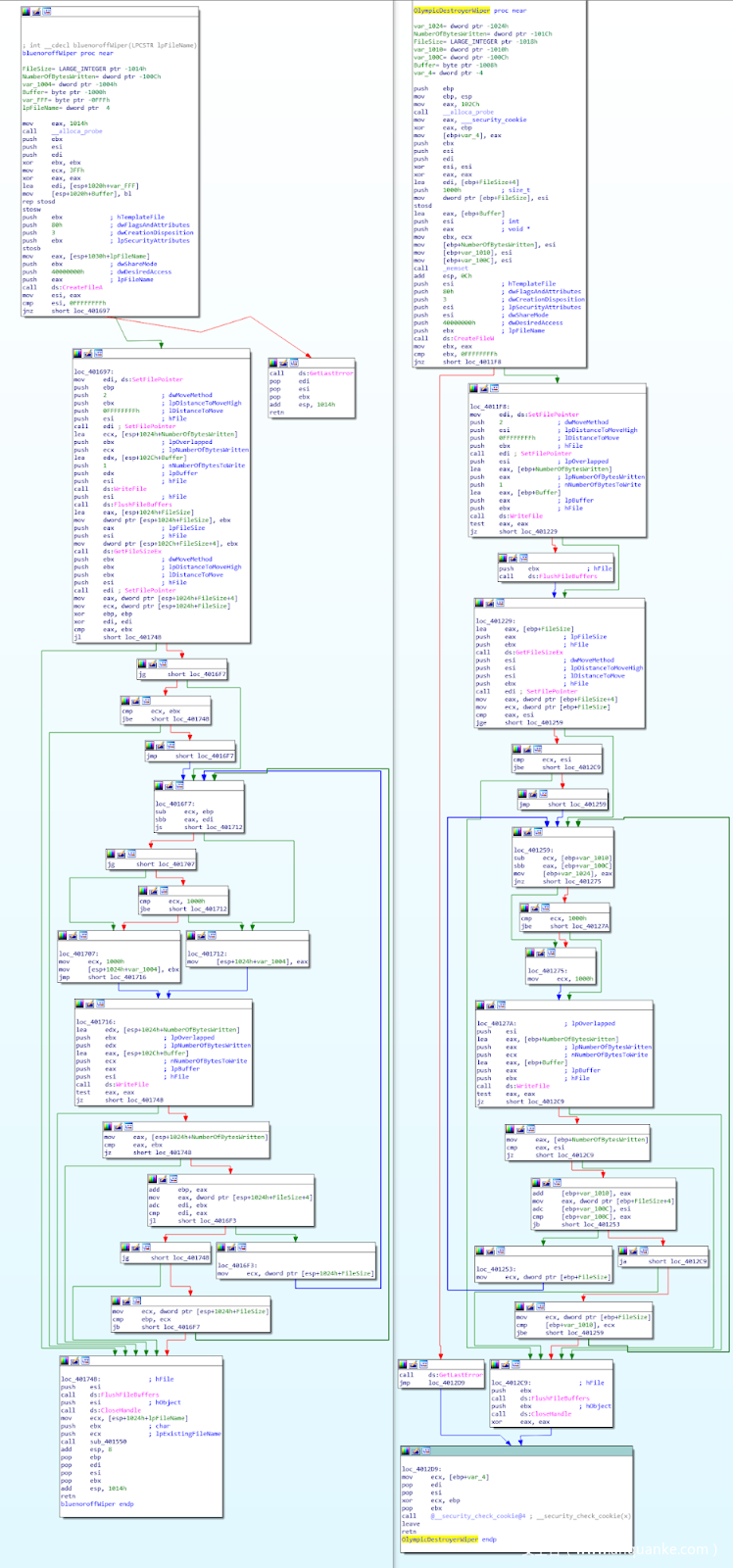 BAE Systems又介绍了Olympic Destroyer以及Bluenoroff组织所使用的wiper恶意软件的相似之处。如下图所示,左侧为Bluenoroff的wiper恶意软件,右侧为Olympic Destroyer的wiper函数:
