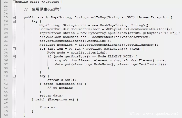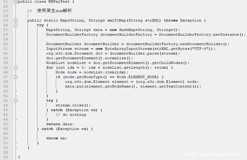 本节使用示例代码来源为某开源支付 Java SDK (https://pay.weixin.qq.com/wiki/doc/api/jsapi.php?chapter=11_1),源文件名:WXPayUtil.java,文件路径为:java-sdk-v3\src\main\java\com\github\wxpay\sdk。