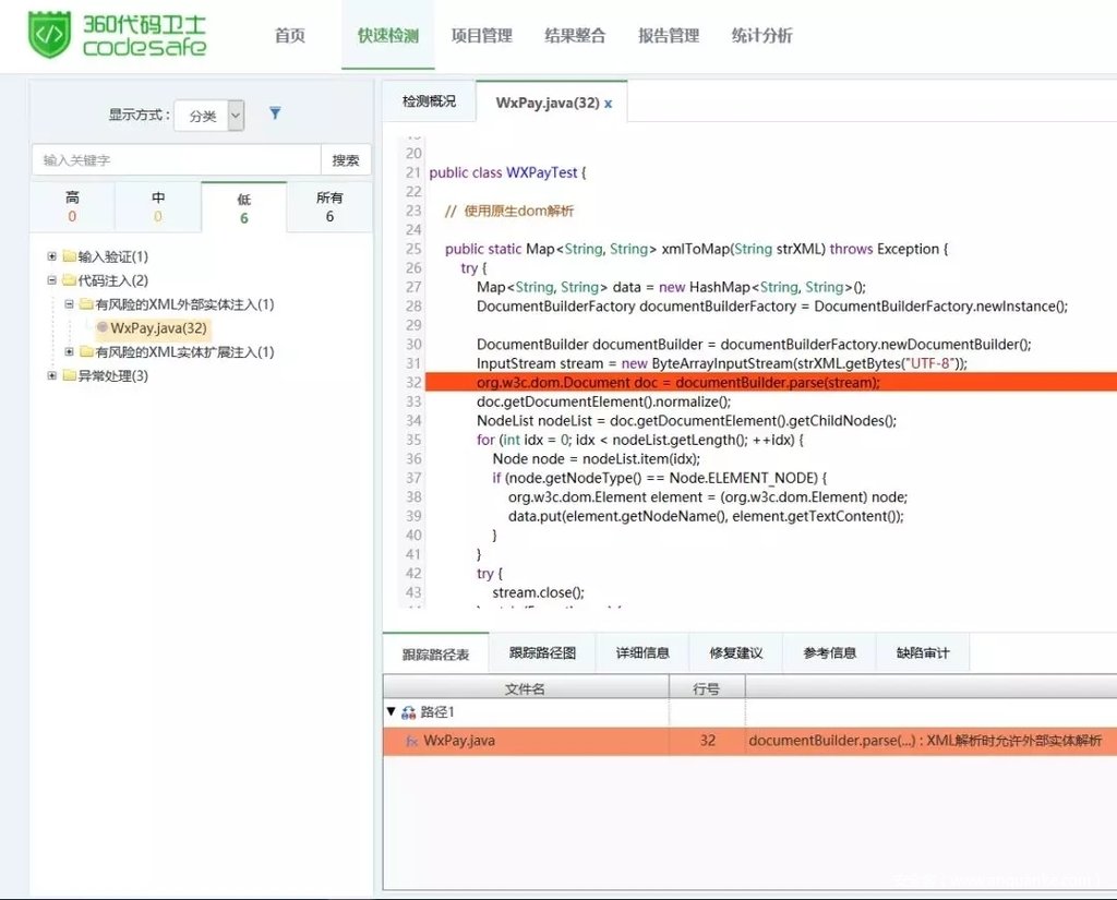 使用360代码卫士对上述示例代码进行检测,可以在文件第32行检出“有风险的XML外部实体注入”缺陷。如图1所示: