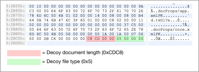 执行时,恶意软件将读取自身的最后8个字节。这些字节包括两个DWORD,它们既包含嵌入的诱饵文档的长度,也包含它的文件类型。