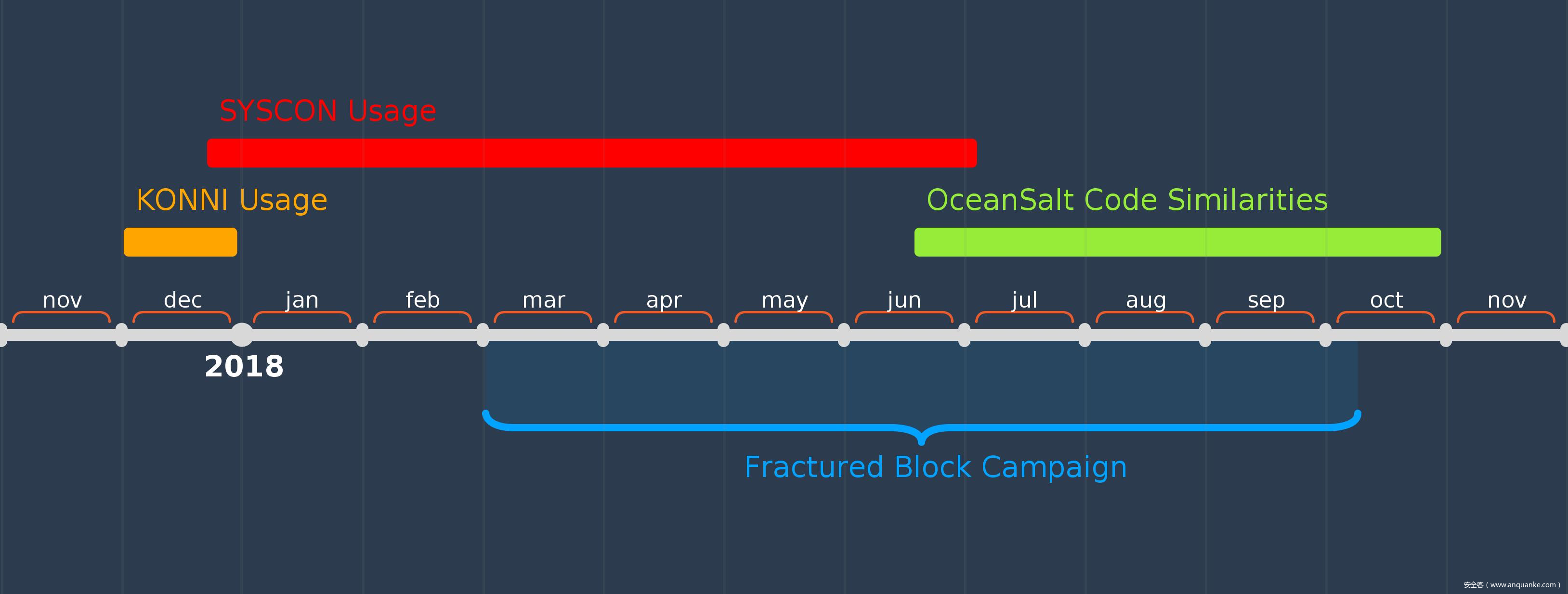 该家族与OceanSalt恶意软件有效载荷也可能有一定关联。McAfee在2018年10月首次进行了攻击报道,受害者包括韩国、美国和加拿大。与McAfee报告中列出的样本信息一样,在Fractured Block 攻击中观察到的OceanSalt样本使用与Comment Crew(又名APT1)相同的代码,但是研究人员认为这些相似的代码是错误的标志。Comment Crew使用的恶意软件已经活跃了多年,因此研究人员表示此次活动与Crew活动的关联性存疑。相关威胁活动的时间重叠表: