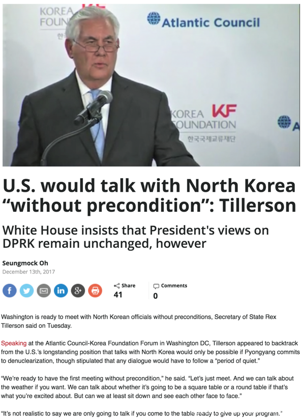 文章主要讨论了美国与朝鲜之间的外交关系,并且引用了NKNews[.]org当天发布的文章(文章链接为:https://www.nknews.org/2017/12/u-s-would-talk-with-north-korea-without-precondition-tillerson/ )。被引用的文章内容为: