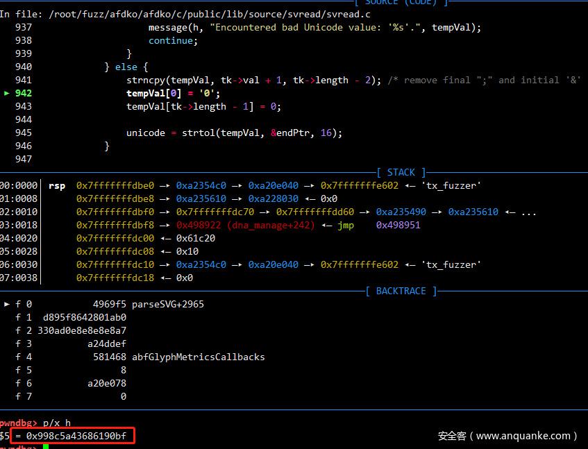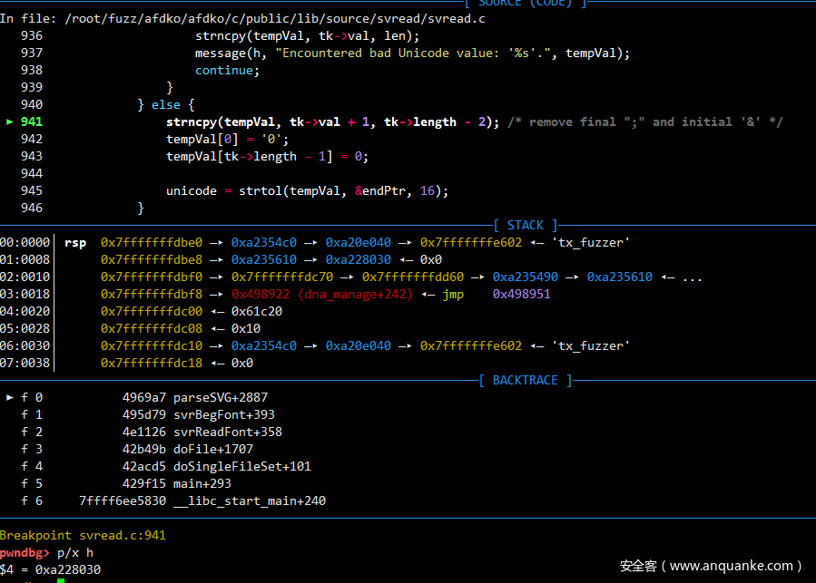 #0 0x0000000000496010 in parseSVG (h=0x998c5a43686190bf) at ../../../../../source/svread/svread.c:864