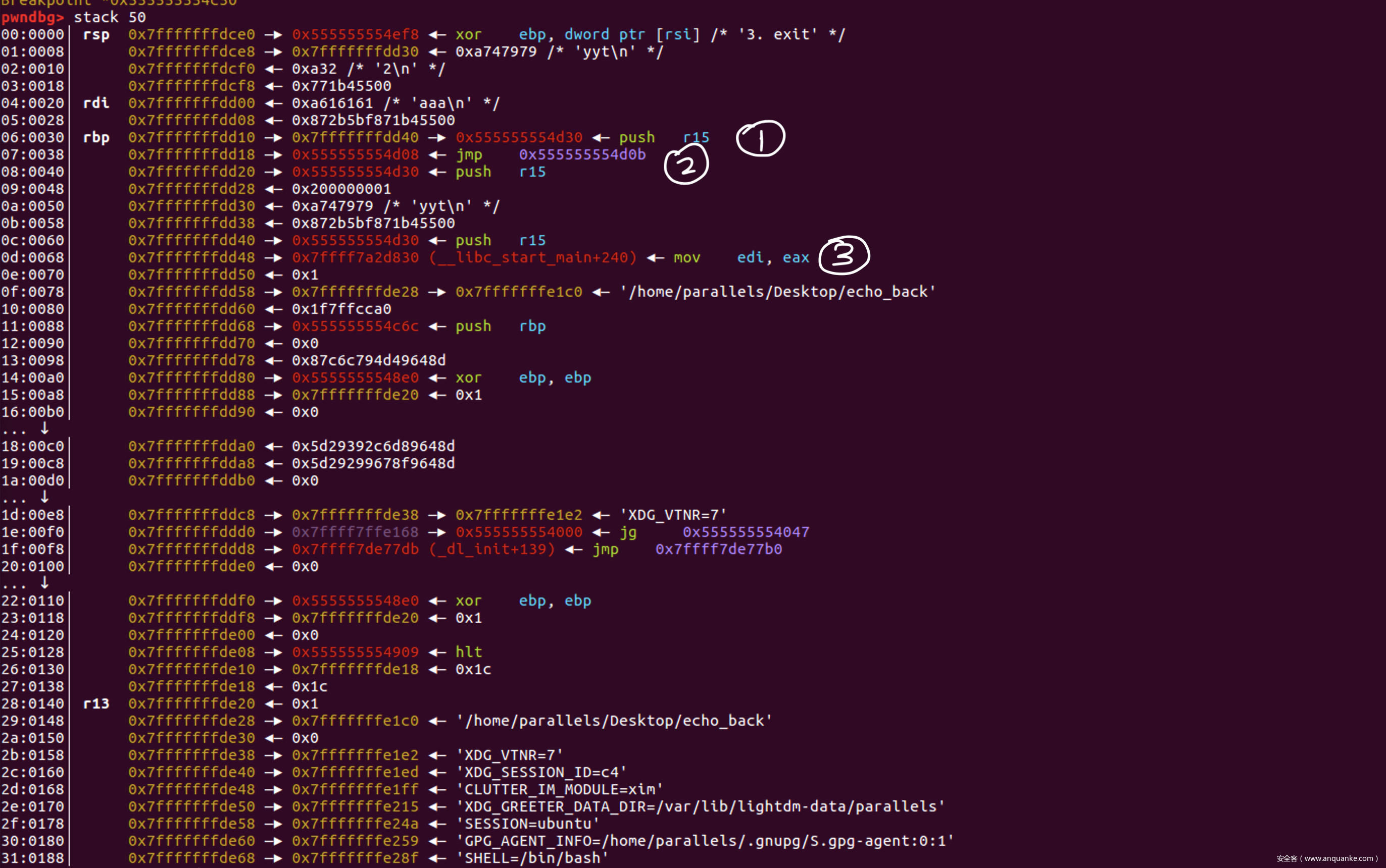 这里我标出了三个内容(计算偏移时不要忘了这是64位程序,前六个参数保存在寄存器里):