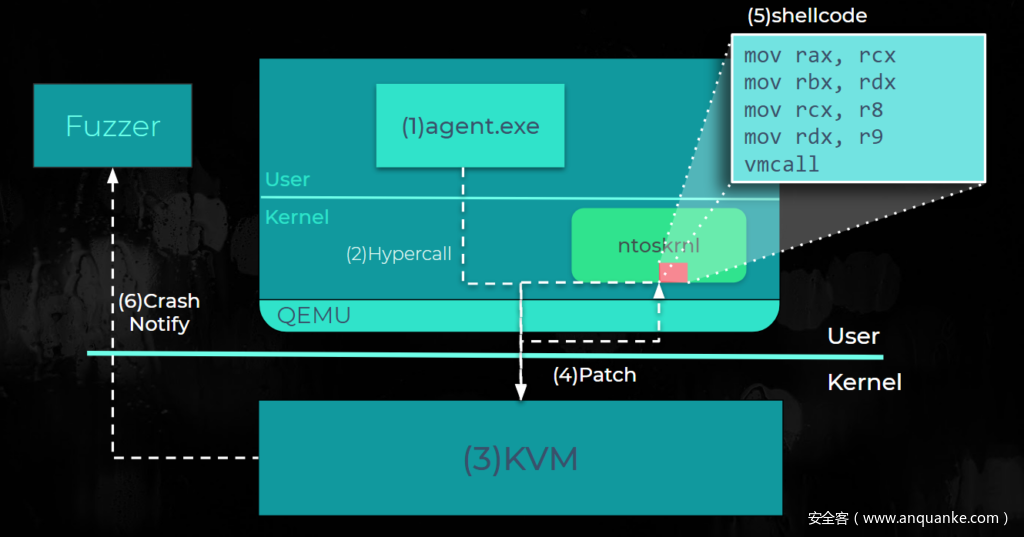 VM内的agent(1)使用BugCheck和BugCheckEx的地址向KVM发出hypercall(2),KVM(3)使用shellcode(5)依次对这些地址进行打补丁(4),该shellcode在执行时会发出hypercall。