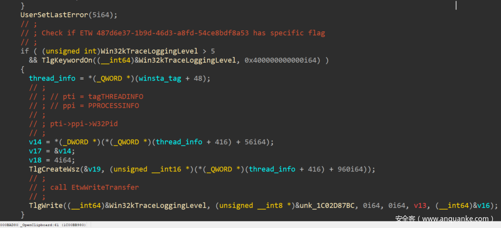 我们注意到,崩溃发生在条件块内,该条件块是否执行取决于ETW provider的标志:Win32kTraceLoggingLevel。