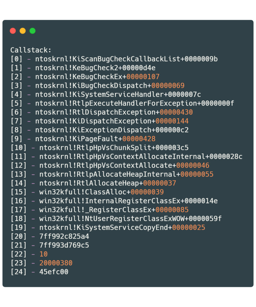 这个解决方案比之前的方案好得多。重复数据删除机制现在基于故障框架,我们还得到了BugCheck错误代码、寄存器和调用堆栈。