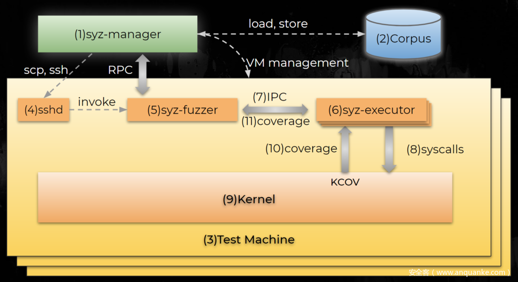 从之前的运行中加载程序的语料库(2),启动多个测试(3)机器,使用ssh(4)将executor(6)和fuzzer(5)二进制文件复制到机器中,执行Syz-fuzzer(5)。