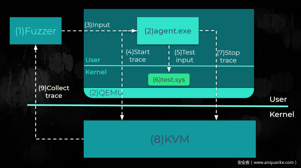 接下来,代理通知hypervisor开始(4)收集覆盖率。然后,代理将输入发送(5)到目标内核组件:例如,如果我们以负责解析压缩映像的名为test.sys的驱动程序(6)为目标,则代理将生成的输入发送到驱动程序以对其进行测试。