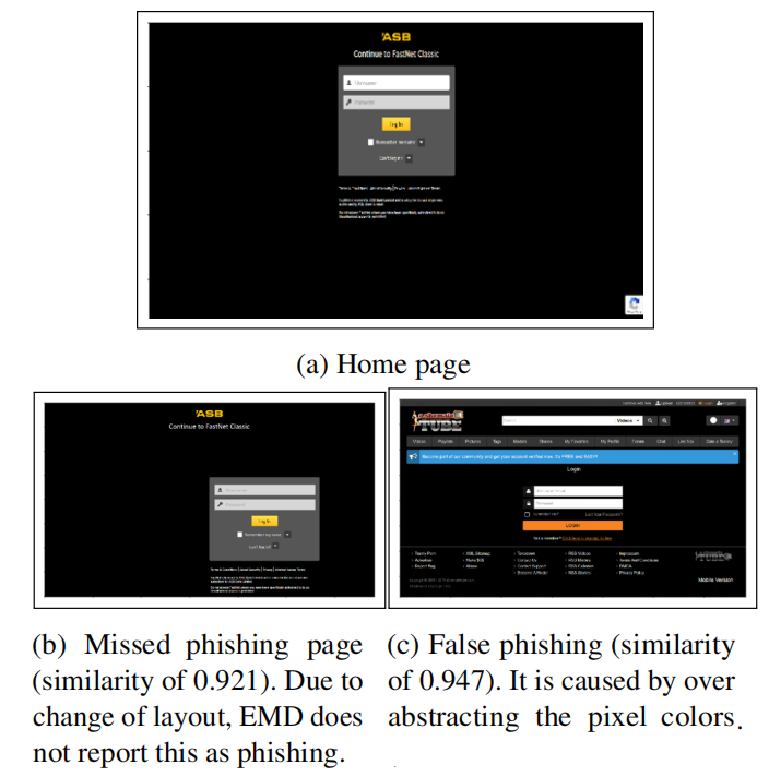 基准定性分析:EMD受困于从网页屏幕截图中提取粗略特征(例如,像素颜色)。下图显示了一个网络钓鱼页面EMD misseded报告(假阴性)和一个错误报告的页面(假阳性)。