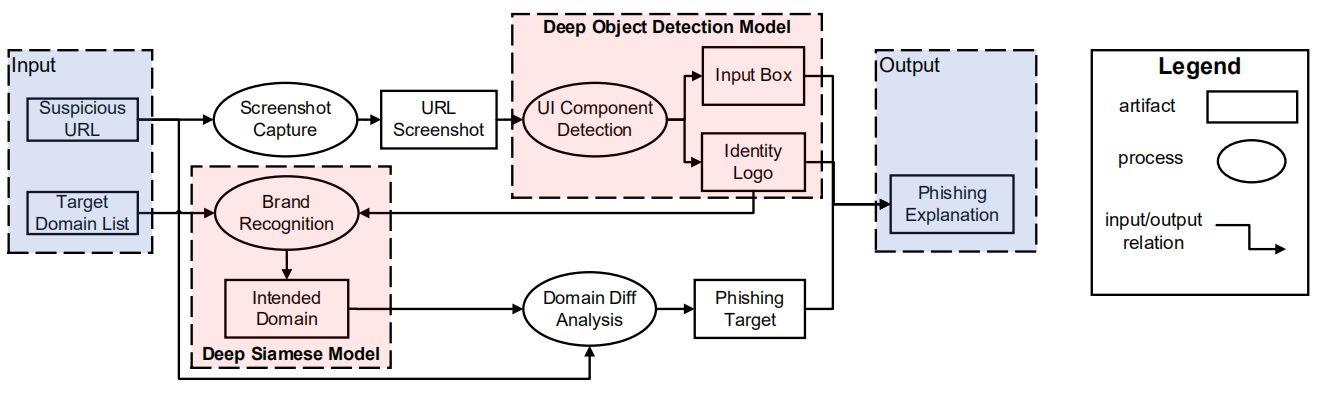 给定一个URL,首先在沙盒中捕获其屏幕截图,然后将网络钓鱼识别任务分解为两个:对象检测任务和图像识别任务。首先,在屏幕快照中使用对象检测算法来检测重要的UI组件,特别是identity logo和输入框。下一步通过Siamese模型,将检测到的identity logo与目标品牌列表中的logo进行比较,从而确定网络钓鱼的目标。一旦目标品牌列表中的logo(例如Paypal的logo)匹配,将其对应的域(例如paypal.com)视为捕获的屏幕截图的预期域。随后分析目标域名和给定URL域名之间的差异,以报告网络钓鱼结果。最后结合了报告的identity logo,输入框和网络钓鱼目标,以合成可视化的网络钓鱼说明。