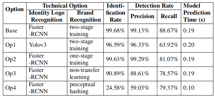 对于Op1,选择一种流行的一级目标检测模型Yolov3。采用通过Tensorflow 1.4框架实现的Yolov3模型。在训练Faster-RCNN模型的同一集群上训练模型。对于Op2,将经过一阶段训练的Siamese模型与经过两阶段训练的模型进行比较。对于Op3,使用Triplet损失以传统方式训练Siamese模型。在本实验中,使用三重态损失函数训练模型。对于Op4,用实现的标准感知哈希算法替换了Siamese模型。