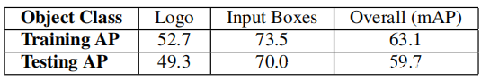 在带有标签的屏幕截图数据集中使用约29K个样本来训练模型,并使用约1600个样本进行测试。计算每个类(即logo和输入框)的IoU阈值的平均精度(AP),范围从0.5到0.95,间隔为0.05。下表给出了结果。与Faster RCNN相比,PASCAL VOC数据集上的mAP为67.9 ,在本实验中,预测logo和输入框所达到的mAP(即训练为63.1,测试为59.7)表明性能可接受。