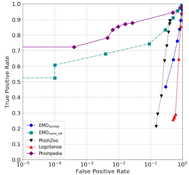 上表列出了这些方法的最佳结果(识别率,准确性和召回率之间的平衡)。请注意,所有方法都将URL作为输入,因此它们都具有将URL转换为其屏幕截图的相同过程和成本,这平均需要大约1.88s。同样,优化网络通信和捕获屏幕截图的技术不在这项工作的范围之内。请注意,在识别率,检测率和运行时开销方面,Phishpedia优于基准方法。 EMDnormal具有与Phishpedia相似的运行时效率,但识别和检测精度较差。相比之下,EMDmore_ref在精确度和召回率方面却获得了更好的性能,但是在更高且不切实际的运行时上–平均而言,处理给定的网页需要15.6秒。PhishZoo还需要大量的计算时间来确定网页,而LogoSENSE却很低检测和识别率。此外,在下图中绘制了所有识别方法的ROC曲线。随着FPR的降低,除了EMDmore_ref外,观察到了Phishpedia与基准方法之间的差距正在扩大。除了Phishpedia之外,EMDmore_ref是在较低的FPR上实现有意义的召回(TPR)的另一种方法(尽管这会带来较高的计算成本),但是,如果考虑较低的FPR值10^(-2)、10^(-3)和10^(-4) ,这是操作部署所必需的,注意到与EMDmore_ref相比,Phishpedia的召回率仍然更高。