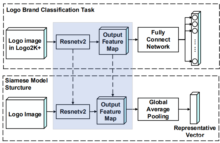 logo比较:这里的关键技术挑战是估计两个logo的相似性。一种简单的解决方案是将logo识别视为图像分类任务,其中输入是logo图像,输出是其品牌。然而,图像分类模型具有两个固有的缺点。首先,分类模型在运行期间无法支持在目标品牌列表中添加新品牌。一旦添加了新品牌,就需要重新培训整个网络。第二,分类模型需要预先定义类别(即设置中的品牌)。因此,给定logo在训练数据集中带有未知品牌,该模型将始终将其归类为现有品牌之一,这可能在实际应用中引起较大的误报。
