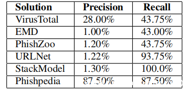 本研究还在钓鱼发现实验中调查了Phishpedia的漏报。请注意,很难获得度量召回率,因为只能通过手动验证基本事实,这对于大规模评估而言是费力的。在此实验中,对1,500个CertStream URL进行了采样。评估发现没有网络钓鱼网址。因此进一步使用PhishCatcher选择了1,500个CertStream URL,并在其中确认了16个真实的网络钓鱼网页。以PhishCatcher报告的上述1,500个CertStreamURL的网络钓鱼标签为标准,比较VirusTotal,EMD,PhishZoo,URLNet,StackModel和Phishpedia的准确性和召回率。结果在下表中给出。与其他基准相比,Phishpedia在精度和召回率之间达到了良好的平衡。
