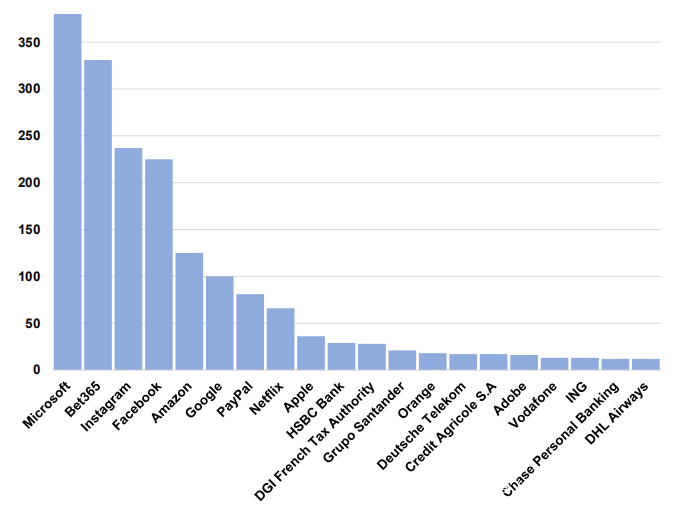 下表总结了发现的网络钓鱼网页的结果。观察到,与其他基准方法相比,Phishpedia报告的网络钓鱼结果要准确得多。实际上,在Phishpedia报告的所有1,820个网络钓鱼网页中,实际的网络钓鱼网页总数为1,704。在Phishpedia识别的这些网页中,有1,133个是被VirusTotal视为良性的新的仿冒网页。这些发现的网页仿冒网页范围超过88个品牌。下图显示了前20个品牌的网络钓鱼网页。按照建议的使用VirusTotal的做法,对所有发现的真实网络钓鱼网页进行了事后分析,发现VirusTotal仍未报告其中的74.6%。
