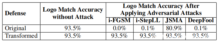 上表报告了对抗攻击对目标检测模型的影响;显示了原始模型和转换模型的预测准确性。同样,下表报告了Siamese模型的对抗攻击结果。至于下表中的logo匹配准确性,将N(= 1,000)个logo输入到Siamese模型中。如果将k个logo与其目标列表中其正确品牌的logo变体匹配,则logo匹配精度计算为k / N。观察到(i)本研究防御技术有效地防御了现有的最新对抗攻击;(ii)Phishpedia的准确性得到了很好的保护,并且不受防御技术的影响。