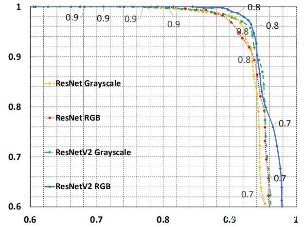 还尝试了一种替代性骨干网和一种替代性输入(就logo颜色而言)。将Resnet50和RestnetV2-50作为骨干网进行实验,并考虑两种形式的logo输入-一种是RGB,另一种是灰度。通过将Siamese模型的相似性阈值从0.5更改为0.9,以0.05为间隔,可以在下图中绘制每种配置的精确调用曲线。通常,四种配置的性能是可比较的并且可以接受。此外,带有RGB logo的Resnetv2(蓝色曲线)可实现最佳性能。根据以上结果得出结论,Faster-RCNN和Siamese模型在识别和比较logo方面均具有良好的性能。