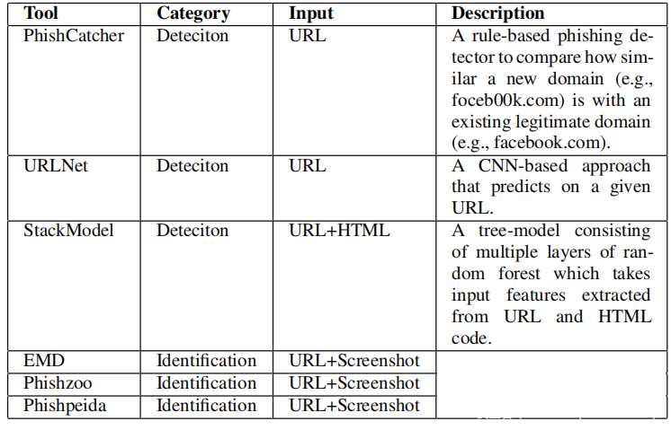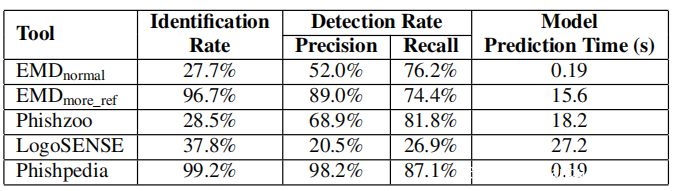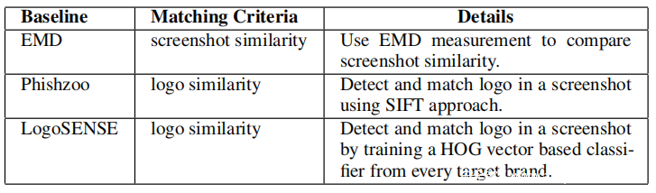选择EMD,PhishZoo和LogoSENSE]作为基准网络钓鱼识别方法。下表显示了基准方法的详细信息。它们代表了不同的基于视觉相似性的识别方法,即屏幕快照相似性(EMD),基于SIFT的相似性(PhishZoo)和基于HOG矢量的相似性(LogoSENSE)。目标品牌列表与包含181个品牌的PhishZoo和Phishpedia相同。
