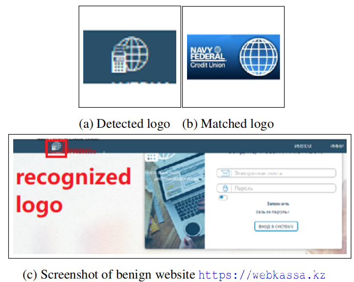 假阳性:当良性网页上的logo看起来像是众所周知的合法品牌logo时,Phishpedia会做出错误的积极预测。如下图所示,良性网站的logo看起来与品牌Navy Federal的logo变体类似(请参见下图b)。这样的一对相似logo混淆了Phishpedia中的Siamese模型。一种补救措施是通过长宽比和更详细的布局对图像相似性施加更严格的限制。