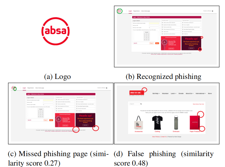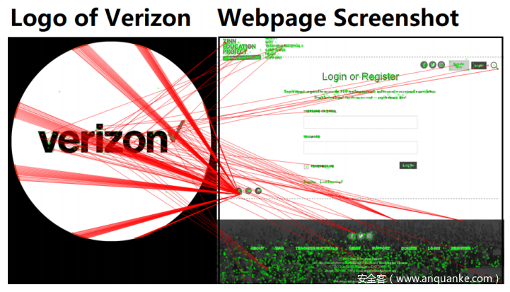一些早期的网络钓鱼识别提议将给定网页的屏幕快照与参考数据库中所有网页的屏幕快照进行比较。例如使用地动距离(EMD,Earth Mover’s Distance)技术来计算两个网页的屏幕截图的相似度。但是,这种方法受到以下的限制:网页及其内容是动态的,并且也经常更新。这会导致精度降低;此外,计算开销随着引用的屏幕截图数量的增加而增加。因此,最近的工作转移到使用品牌的真实身份(logo)来进行网络钓鱼识别。在参考数据库中将可疑网站的logo与目标品牌的logo进行比较网页及其设计的变化。此外,随着尺度不变特征变换(SIFT, Scale-Invariant Feature Transform)等技术的出现,有可能比较尺度和方向不同的图像。但是,基于SIFT的方法不仅在计算上昂贵(本研究实验表明处理每个屏幕截图大约需要19秒)也不准确。如系统所示,SIFToften不会提取与参logo匹配的相关特征点。这也反映在本文的实验评估中。