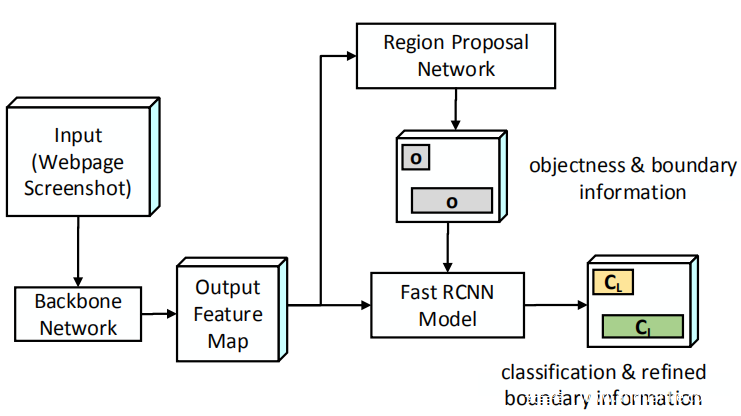 本文分析检测logo和输入框的位置和形状的多种解决方案,并选择Faster-RCNN模型来解决此问题,因为它最能完全满足报告logo的要求。在后文将Faster-RCNN模型与其他候选模型进行比较,简要描述了其网络结构以解释如何将其应用于检测logo和输入框。