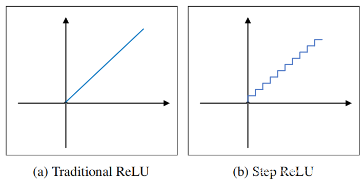 具体来说,将两个模型的某些层中的ReLU函数替换为逐步ReLU函数。在这种方法中,将step-ReLU函数设计为下式,其中传统ReLU的线性函数被替换为step函数;下图对此进行了说明。参数α确定步长函数中的间隙大小。