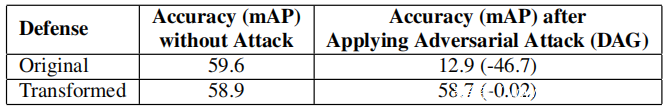 传统的反对抗攻击的防御技术通常采用多种对抗训练方法。但是,对抗训练方法也会降低原始模型的性能,并且对于某些看不见的对抗样本可能无法很好地发挥作用。相反,设计了一种新的简单的对抗防御技术,将Faster-RCNN和Siamese模型转换为可对抗某些基于梯度的众所周知的对抗攻击,同时(i)仍保持模型性能,并且(ii)不需要其他(对抗性)训练,增加了系统的复杂性。