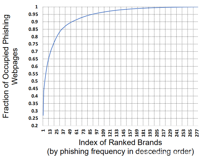 给定已报告的身份logo l,如果其与目标品牌列表中logo lt的相似度高于预定阈值θ,则将相应的品牌报告为网络钓鱼目标品牌。通常能否准确识别检测到的品牌logo,部分取决于受保护品牌的数量。由于世界上有很多品牌,因此一般的品牌识别可能需要非常长的目标品牌列表。但是目标品牌列表的长度不一定那么长。首先,根据OpenPhish feed对大约3万个网络钓鱼网页进行的经验研究表明,排名前100位的品牌覆盖了95.8%的网络钓鱼网页;参见上图。该经验结果与直觉一致,即要使网络钓鱼活动有利可图,攻击者必须将目标对准著名的大型企业或金融实体。此外,用户可以添加新品牌及其logo和域名(例如,本地银行)以自定义受保护的目标列表。