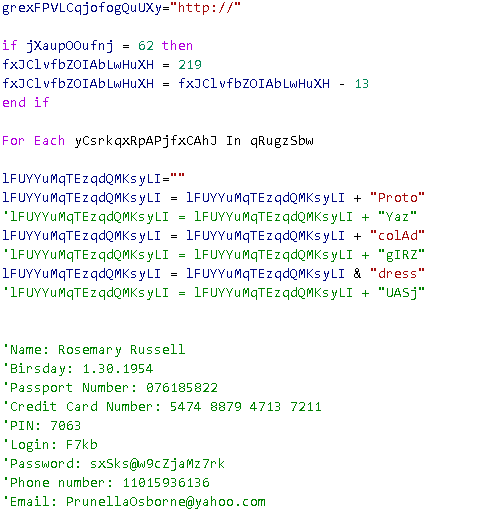通过对关键字符串的拆分和垃圾字符串的引入,针对这类脚本的自动化IOC提取将变得困难,但对人工阅读影响并不十分明显,借助语法高亮等编辑器功能,分析人员还是可以轻松地从代码中获取C2等重要信息。