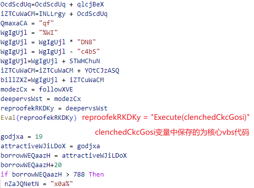 借助360安全大脑的新一代脚本解析引擎,我们对这些混淆风格激进的脚本进行了解析,其上万行的代码只是在拼接出核心代码,拼接完成后再调用Execute和Eval函数进行执行: