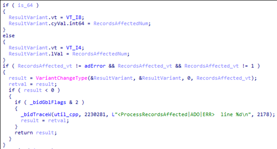 此函数将64位整数变量RecordsAffectedNum转换为带符号的32位整数(此处称为VT_I4类型),并将该值传递给VariantChangeType,以试图将其转换为RecordsAffected_vt类型的变量,即在易受攻击的情况下的VT_DISPATCH。