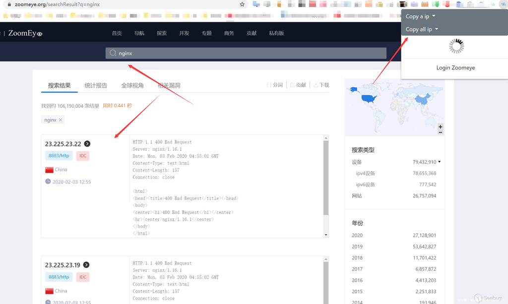 2、我们会完成一些ZoomEye的辅助小功能,比如说一键复制搜索结果的左右ip等…