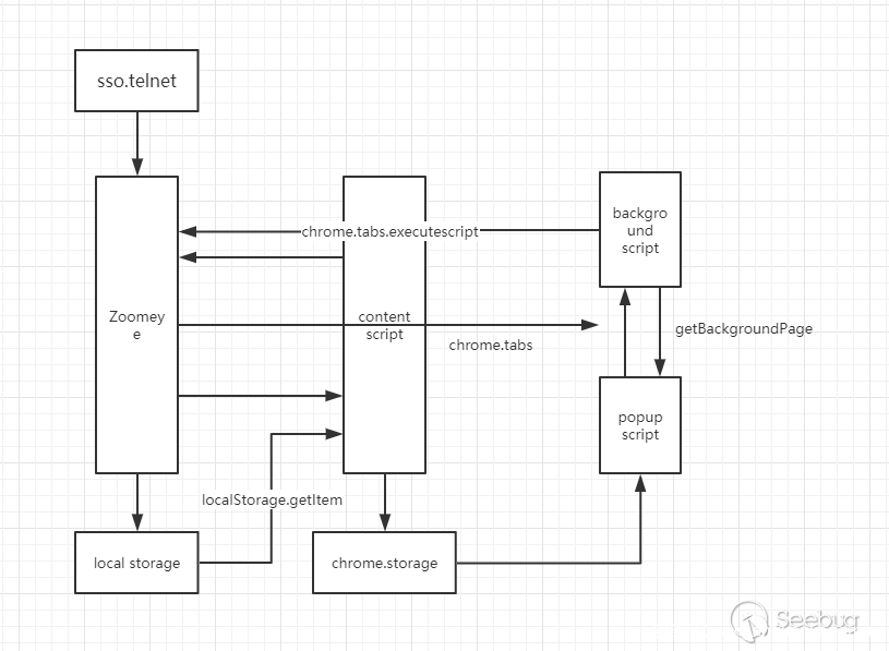由于前后端的操作分离,所有bg script需要一个明显的标志来提示需要获取浏览器前端的登录凭证,我把这个标识为定为了当tab变化时,域属于ZoomEye.org且未登录时,这时候bg script会使用chrome.tabs.executeScript来使前端完成获取localStorage并储存进chrome.storage.