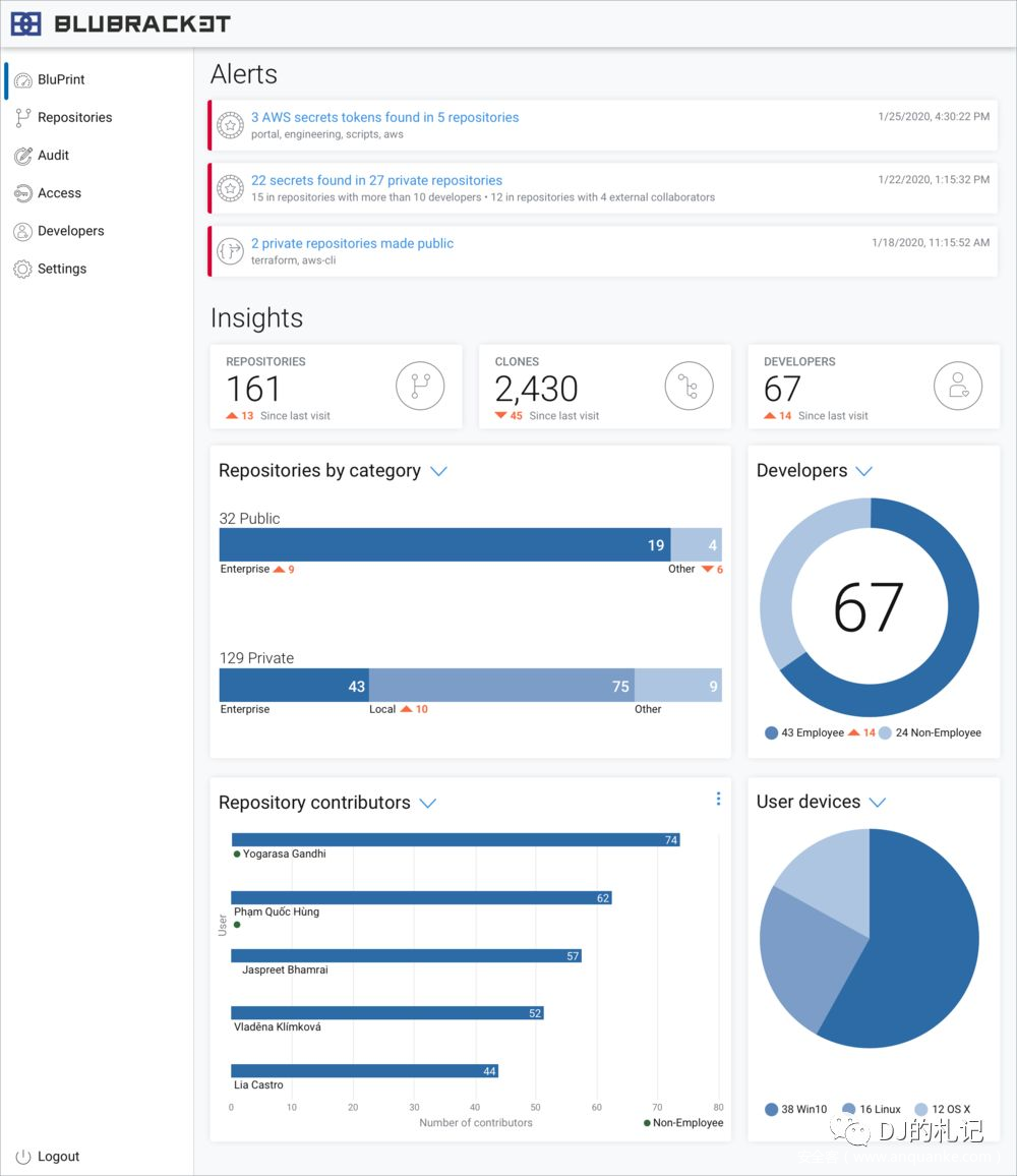 上图界面中,蓝图菜单可以让公司知道自己的代码分布在哪里,包括云和私有代码仓库。警告一栏有代码中发现的秘密和对外公开权限的代码库风险。以及拥有访问权限的用户列表。后台应该是通过服务提供商公开API获取的信息。