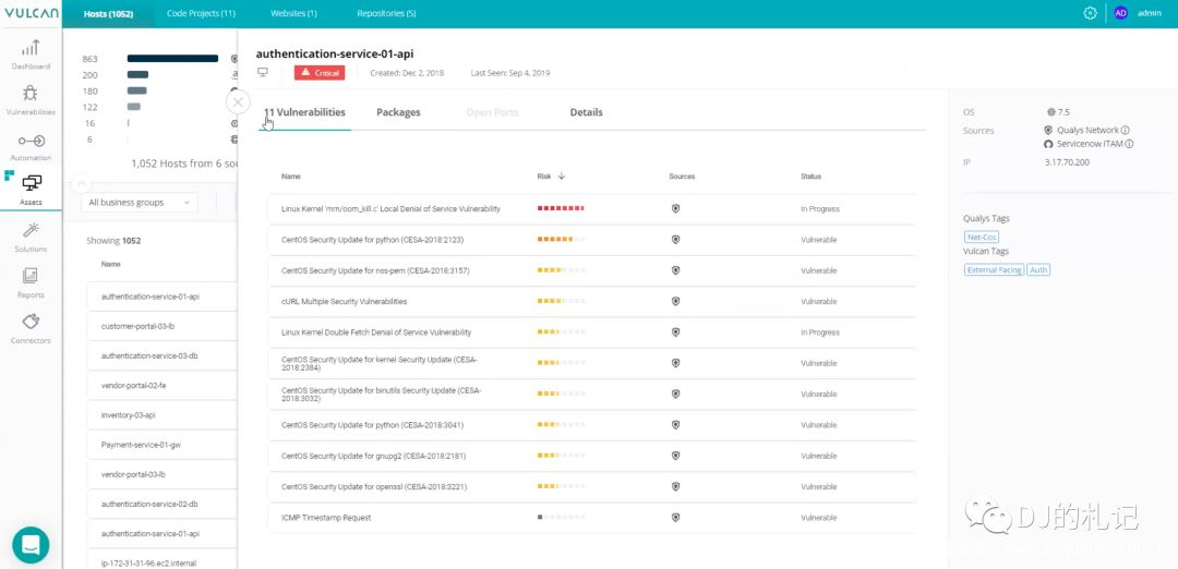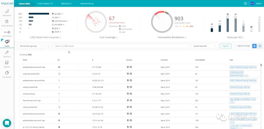 下面是资产相关的用户界面,可以看到从不同厂商处采集汇总而来的数字。有意思的是,Chef和ServiceNow登记的资产,还没有被扫过漏洞,其实漏洞扫描大厂的产品也有接口导入资产数据的,不知道是不是Vulcan故意弄成这样以显示其优势。
