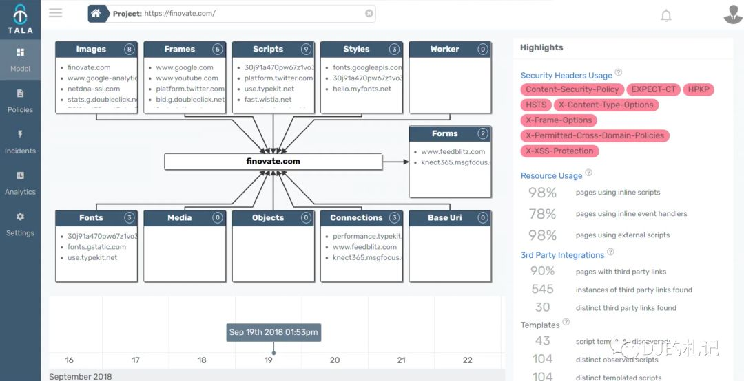 Tala产品主要依靠分析网站元素来生成CSP和SRI,如下图界面所示。坦白讲,这种方法自动构建白名单,如果强行启用block功能,往往会造成一定数量的误杀,是不是能承受就看业务了。