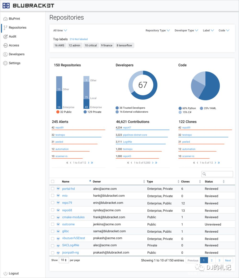还是让我们脚踏实地看看其产品功能和界面吧。简而言之,BluBracket提供了两种能力:第一个模块CodeInsights可以认为是代码资产管理的一个子集;另一个模块CodeSecure描述有些混乱,包括发现代码中出现的各种硬编码的秘密secrets(密码和token之类)和防止代码泄漏,逻辑上有点八竿子打不着的感觉,临时拼凑痕迹明显。从其产品界面图中看不到两个模块的明显界线。
