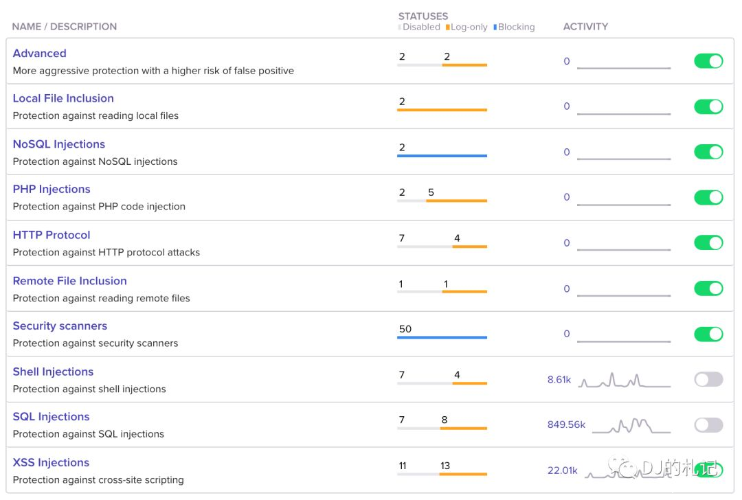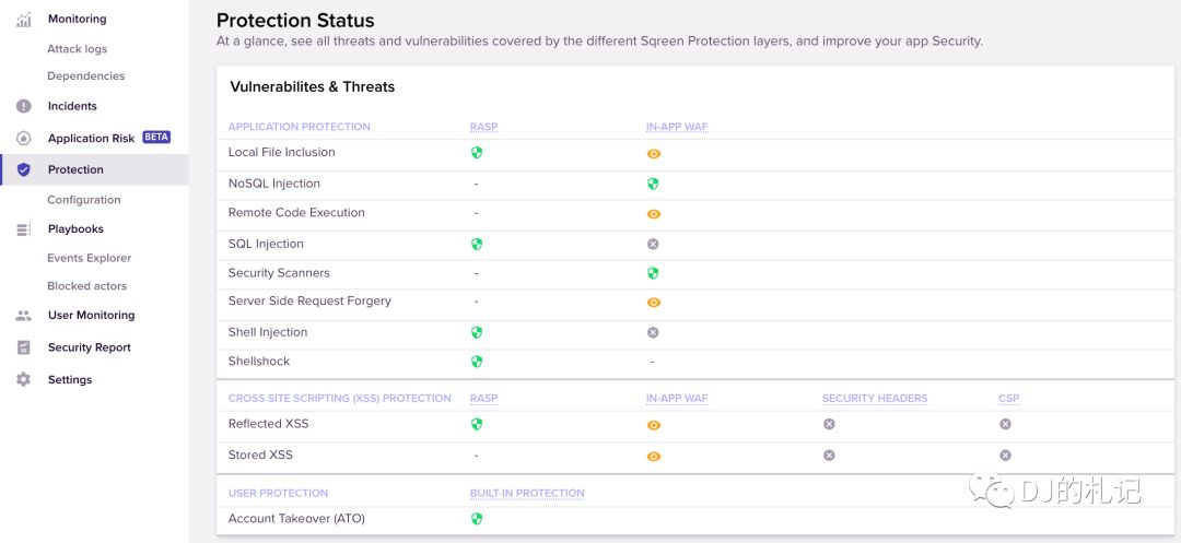 上图的Sqreen界面概括展示了其产品提供的防护功能选择。必须要注意的是,Sqreen在不同平台不同模块中提供的功能有区别,上述列表并非全部覆盖。