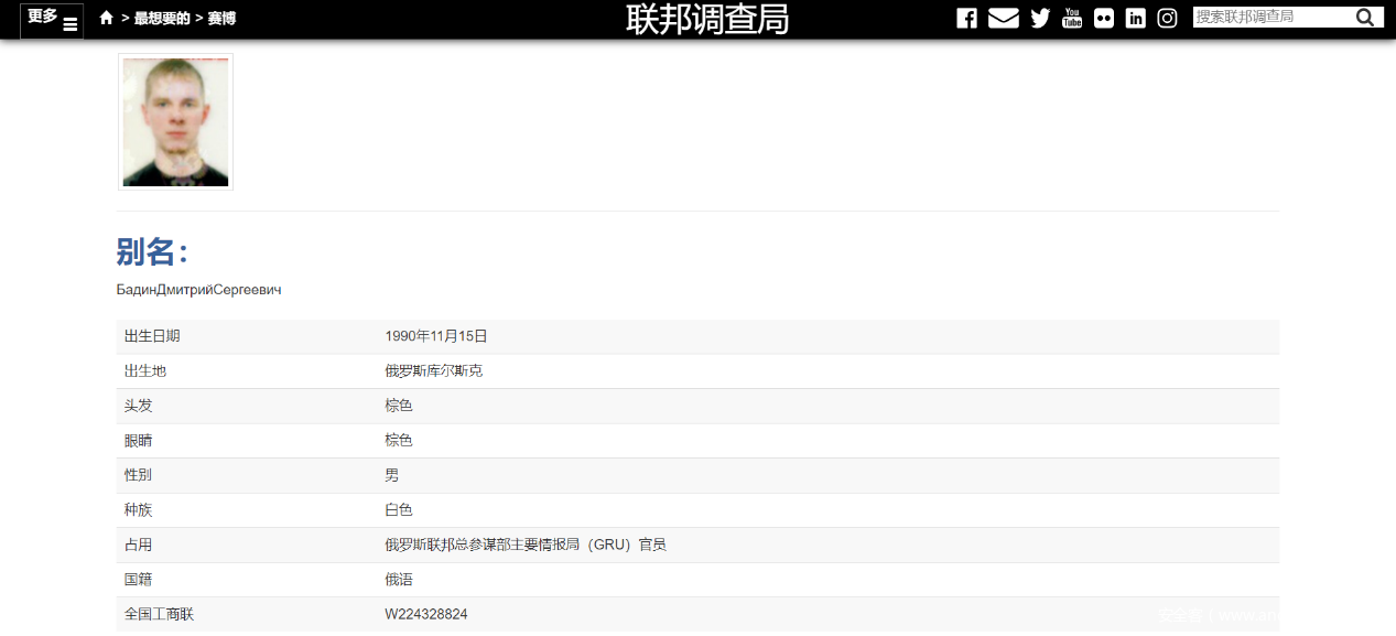 德米特里·谢尔盖耶维奇·巴丁(Dmitriy Sergeyevich Badin,以下简称巴丁):1990年11月出生于俄罗斯库尔斯克,现年29岁,相关资料显示还巴丁是俄罗斯联邦总参谋部主要情报局(GRU)官员,德国当局更是将其归属于著名的APT28“奇幻熊Fancy Bear”组织成员之一。