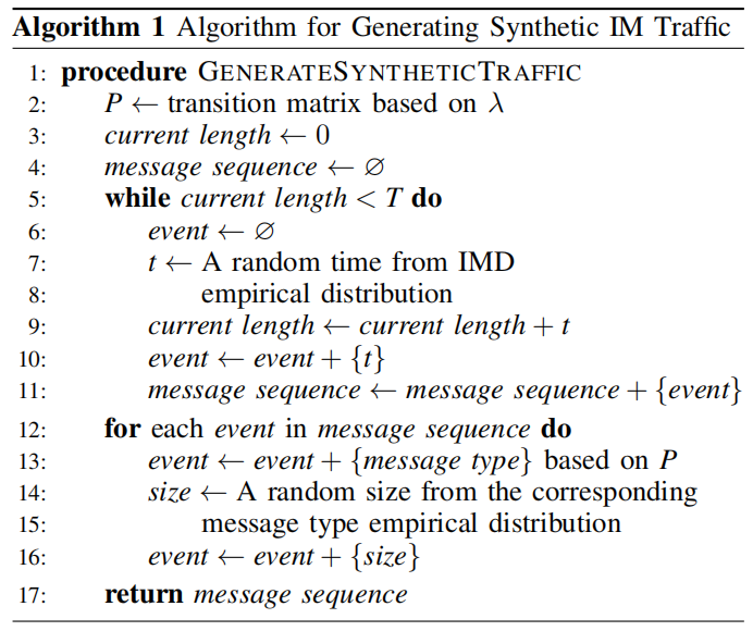 算法的输入是λ,即要合成的频道的消息率(每天),T是合成频道的长度。首先,该算法使用IMD的经验分布创建一系列IM消息时序。然后,算法将Markov模型用于消息类型,以便为序列中的每个消息分配类型。最后,对于每条消息,算法都使用相应消息类型的大小的经验分布来找到其大小。该算法的输出是一系列IM消息,其中每个消息都有一个时间戳,一个大小和一个消息类型。